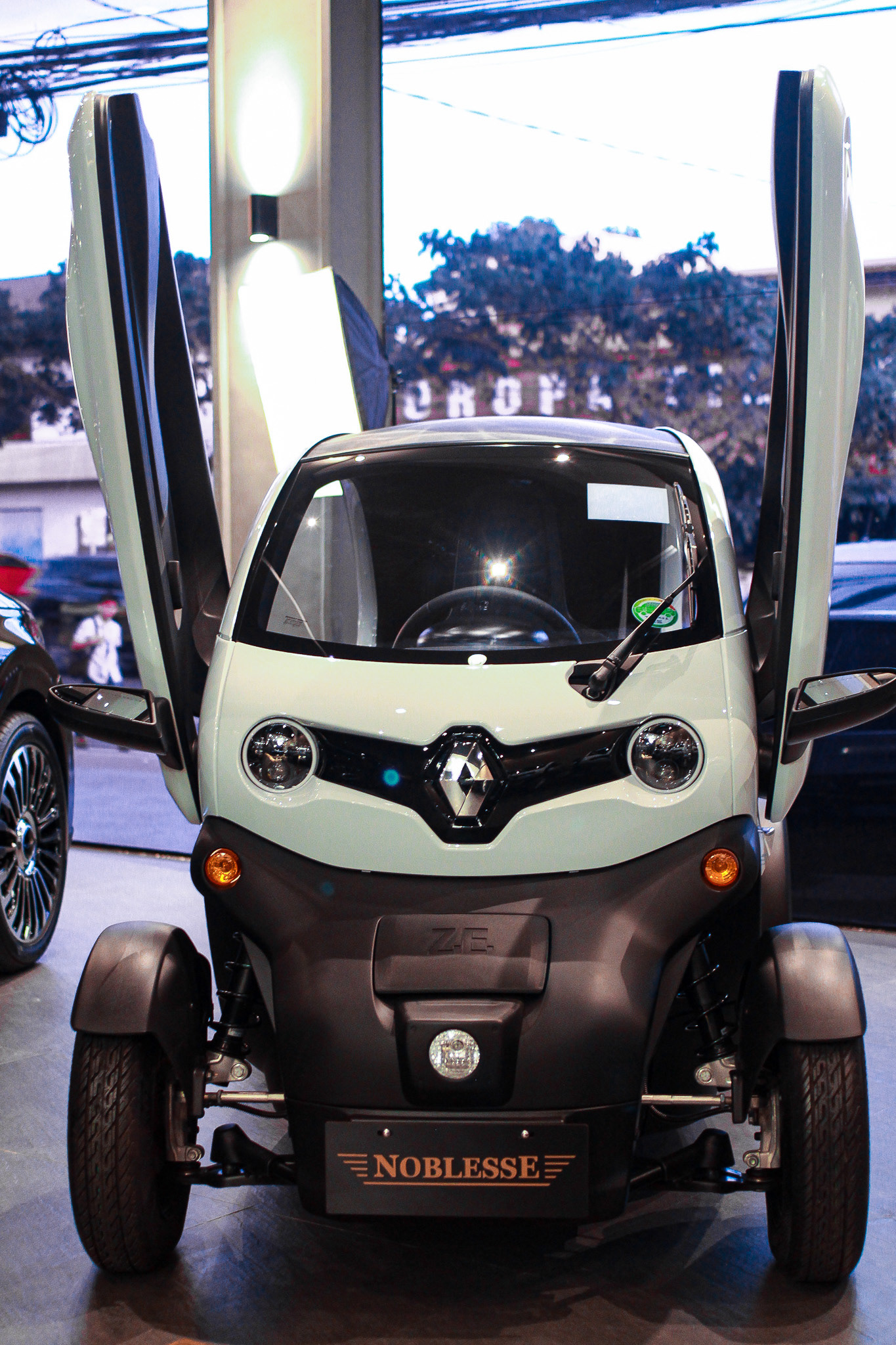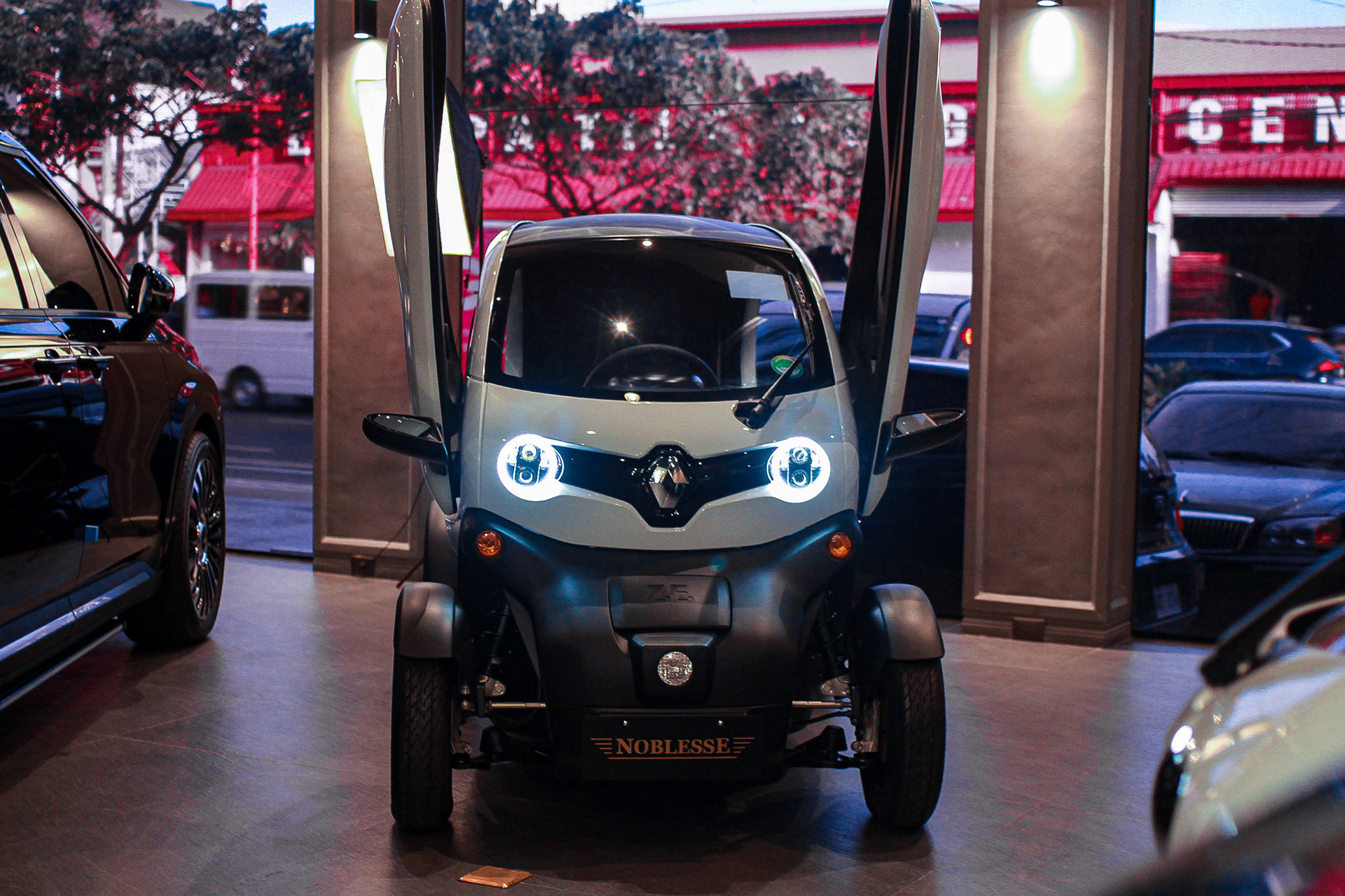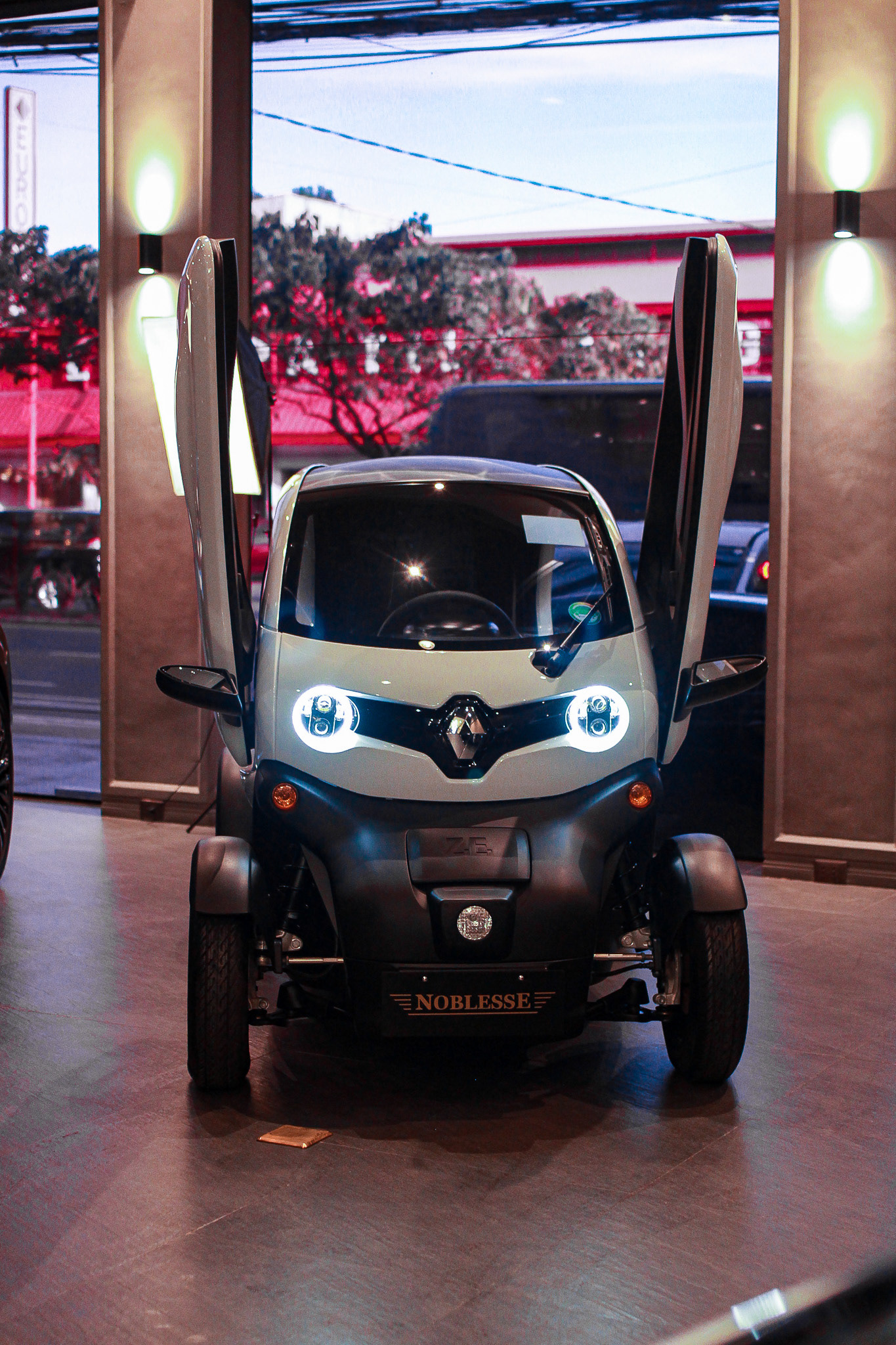 The Renault Twizy is easy to park and maneuver due to its compact dimensions of 2.34 m in length and 1.23 m in width. A standard parking space can accommodate two Twizys. The Lamborghini-style scissor doors contribute to its ability to fit into tight parking spaces.