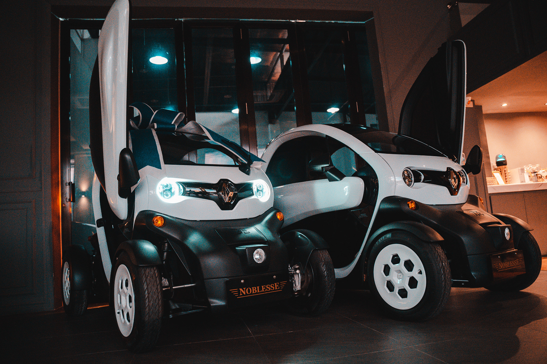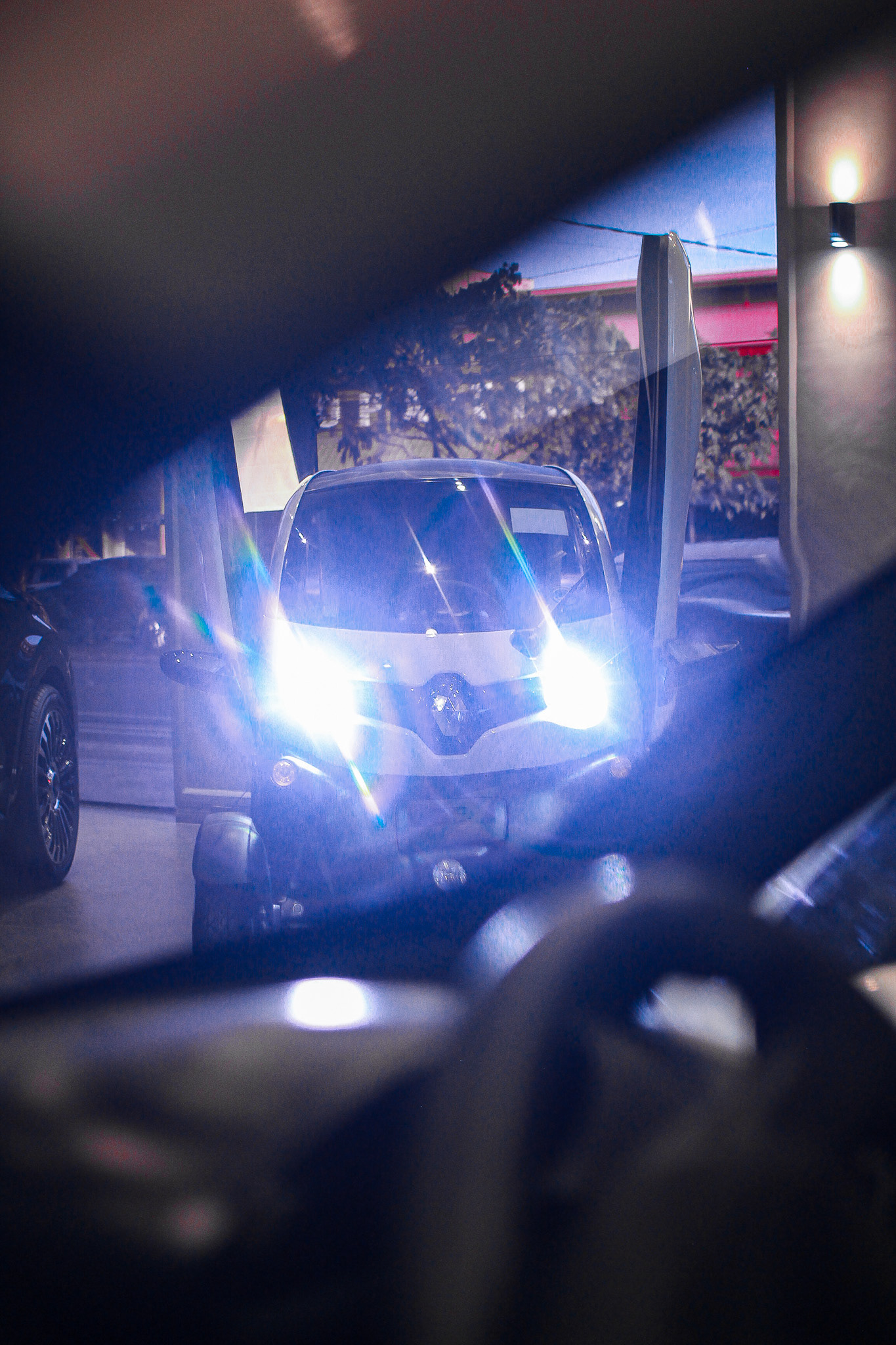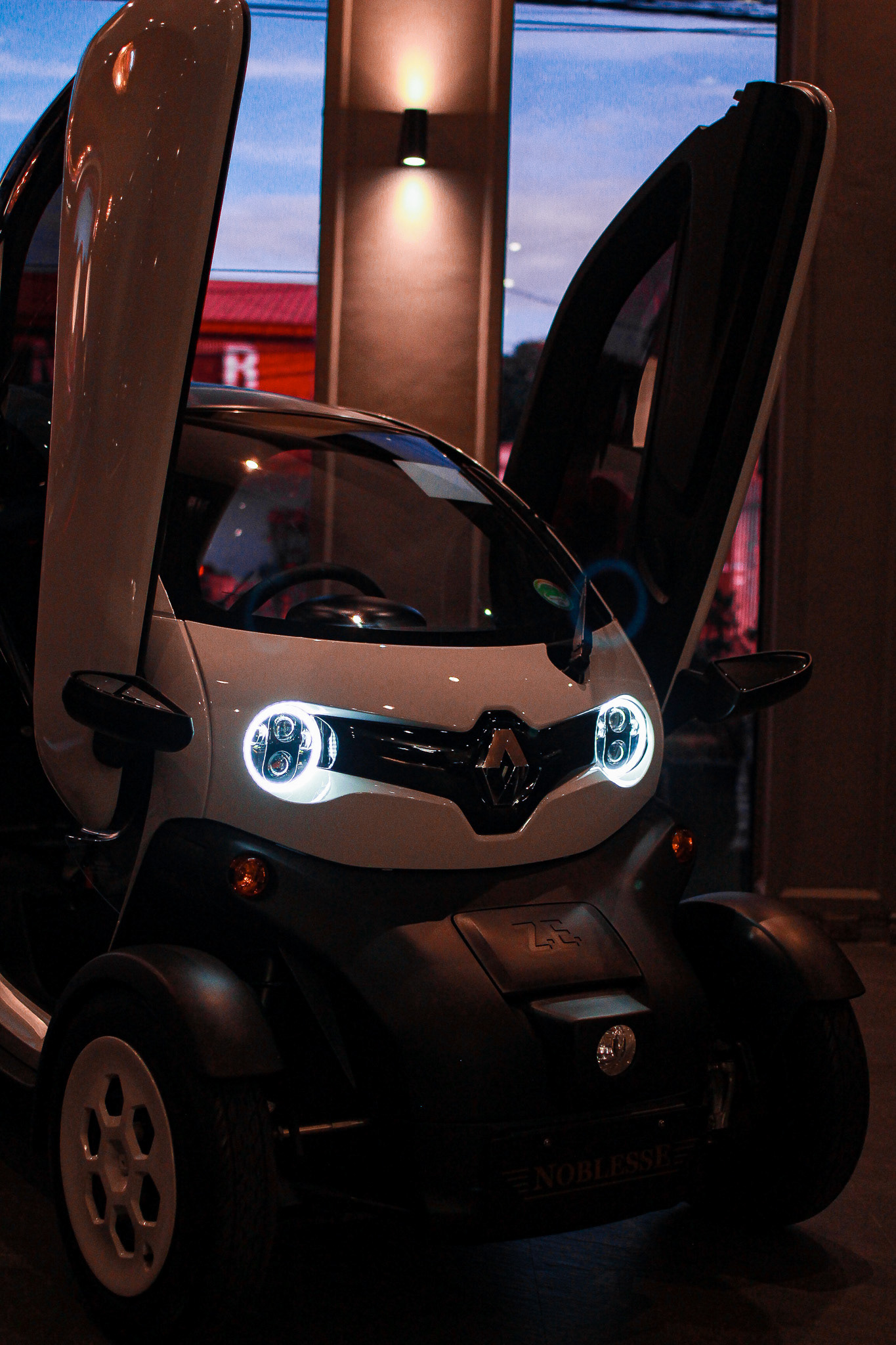 The Renault Twizy is easy to park and maneuver due to its compact dimensions of 2.34 m in length and 1.23 m in width. A standard parking space can accommodate two Twizys. The Lamborghini-style scissor doors contribute to its ability to fit into tight parking spaces.